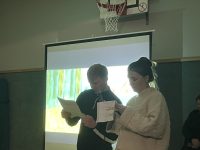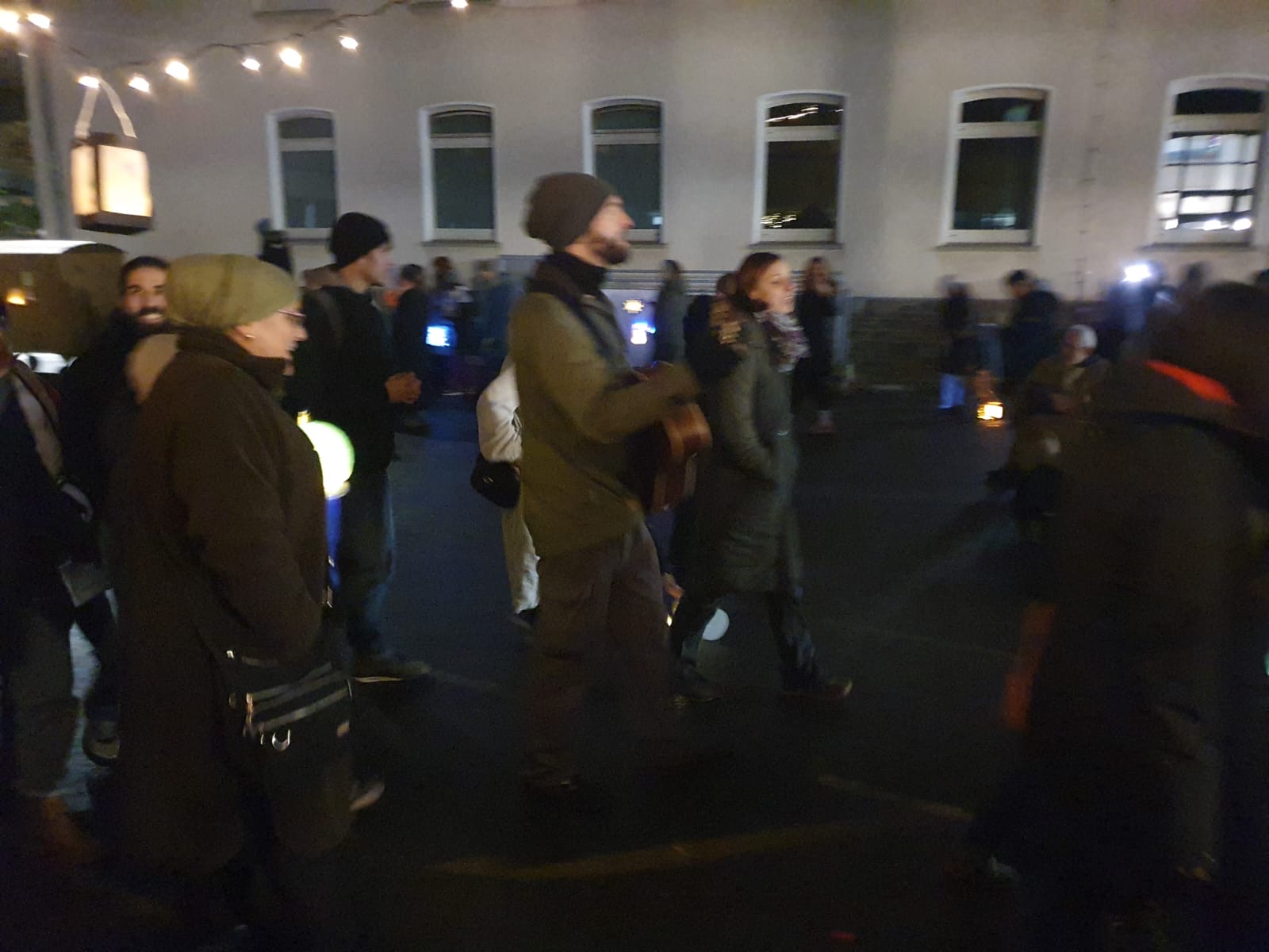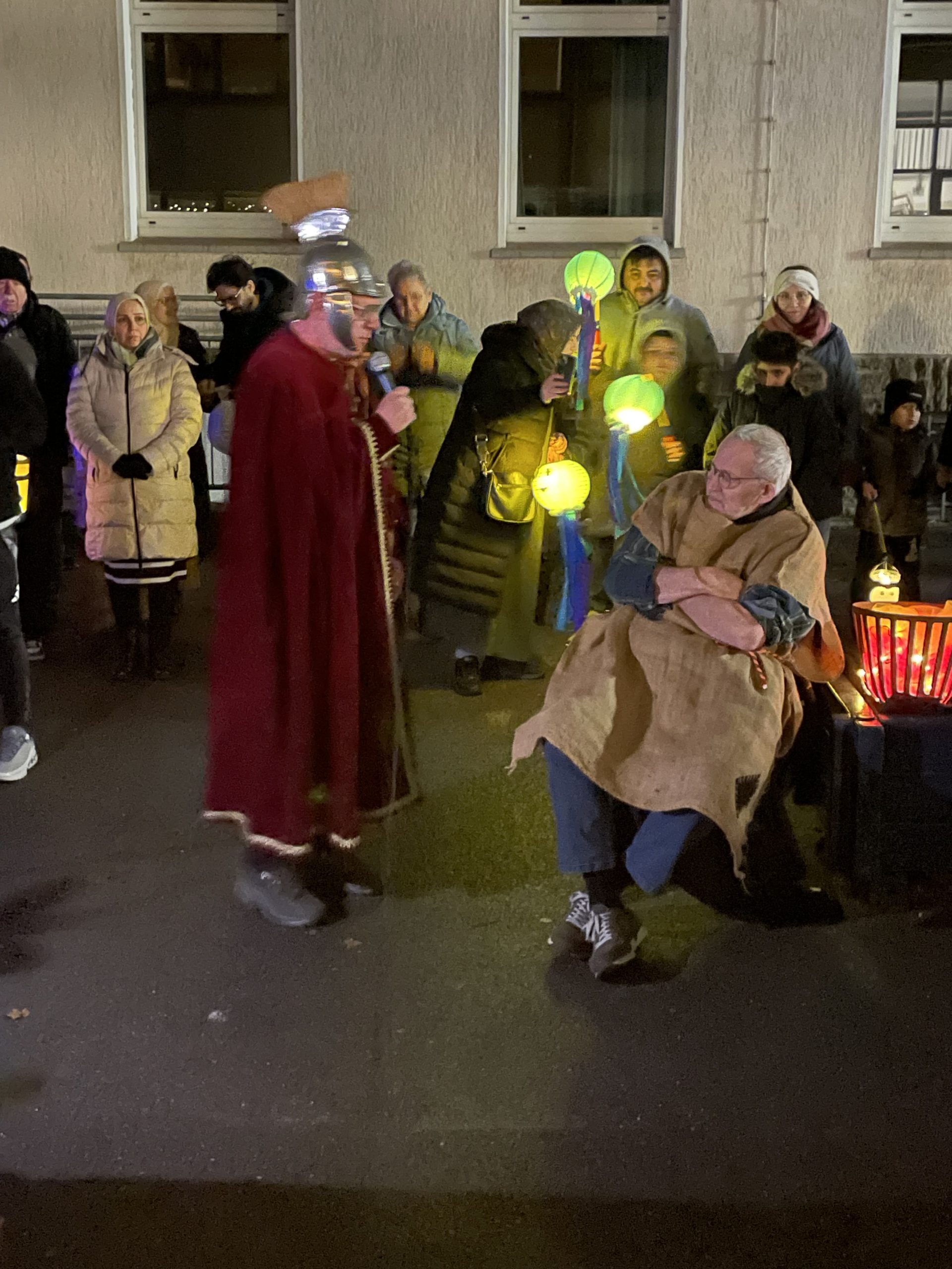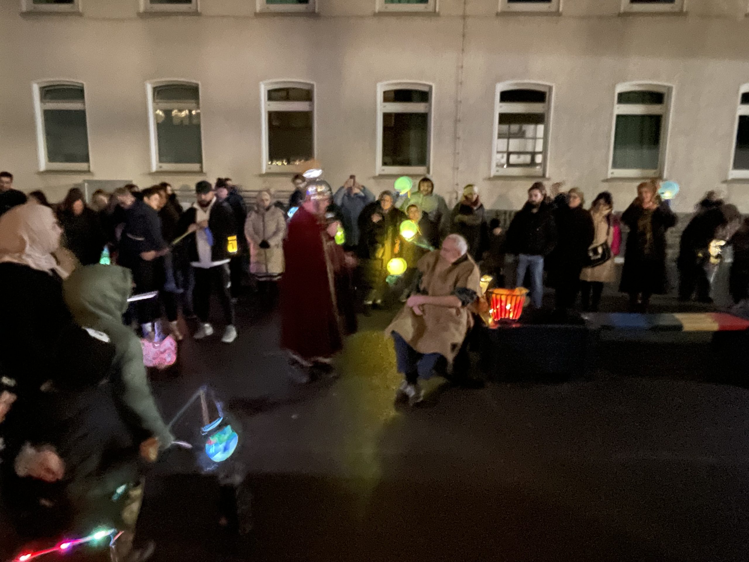 In der Turnhalle gab es zuerst eine Präsentation der Martins-Geschichte in einfacher Sprache mit einem eKami. Danach sind alle Kinder mit ihren Klassenlehrerinnen und Klassenlehrern über den Schulhof gelaufen. Die Kinder trugen ihre liebevoll selbst gebastelten Laternen, die sie vorher in den Klassen mit viel Mühe gemacht hatten. Gemeinsam haben alle schöne Martinslieder gesungen. Auf dem Schulhof konnten wir danach ein Martinsspiel mit St. Martin und dem armen Mann anschauen. Die Darsteller haben ins Mikrofon gesprochen, damit alle die Geschichte gut verstehen konnten.