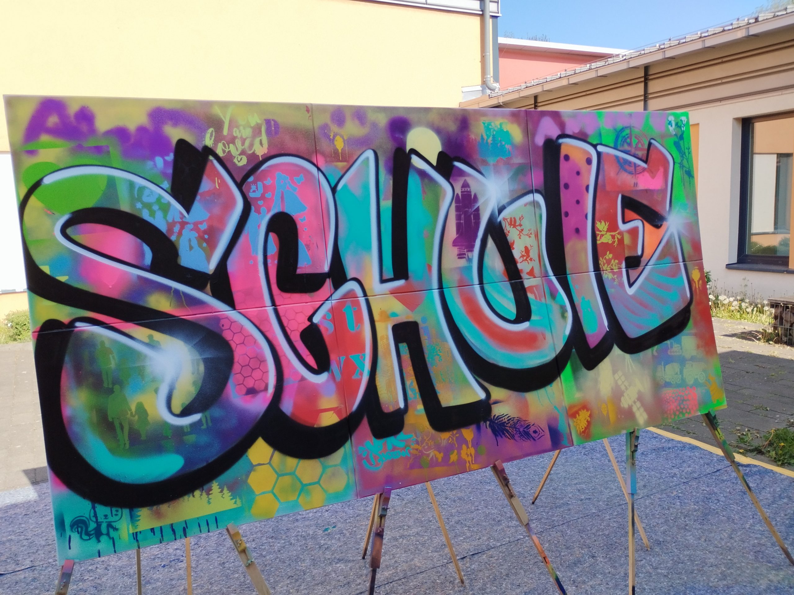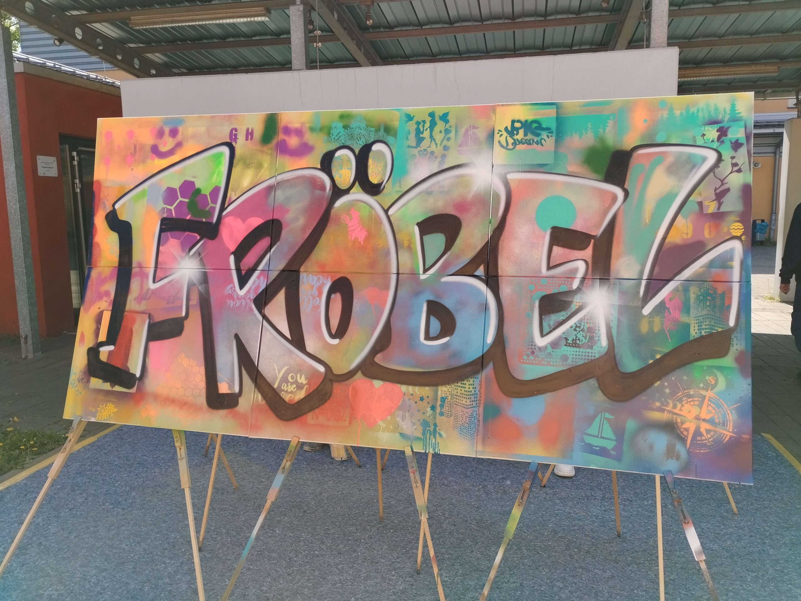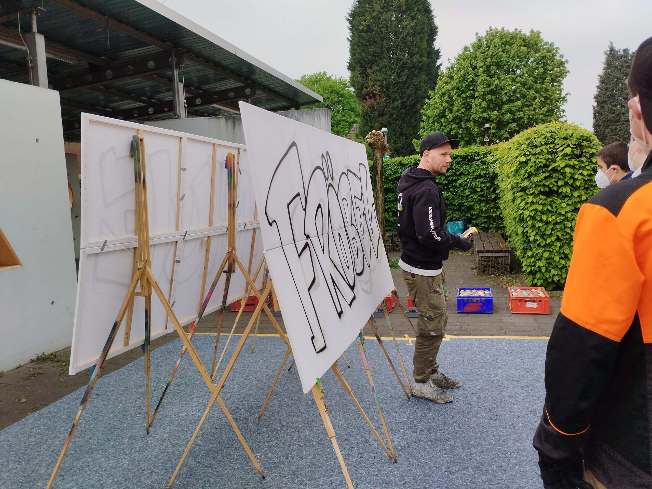 Am Dienstag, 21.04.26, fand mit SchülerInnen der Oberstufe endlich der lang ersehnte Graffiti Workshop mit dem Künstler Mark Roberz von Mr. Graffiti statt ( www.mrgraffiti.de ). Acht SchülerInnen haben dabei auf zwei Leinwänden den „Fröbel Schule“ Schriftzug mit viel Farbe und Schablonen gestaltet. Alle waren mit sehr viel Spaß und Kreativität dabei, so dass am Ende ein tolles buntes Ergebnis entstanden ist. Dieses kann seit Freitag nun auch im Eingangsbereich am Paschacker bewundert werden.