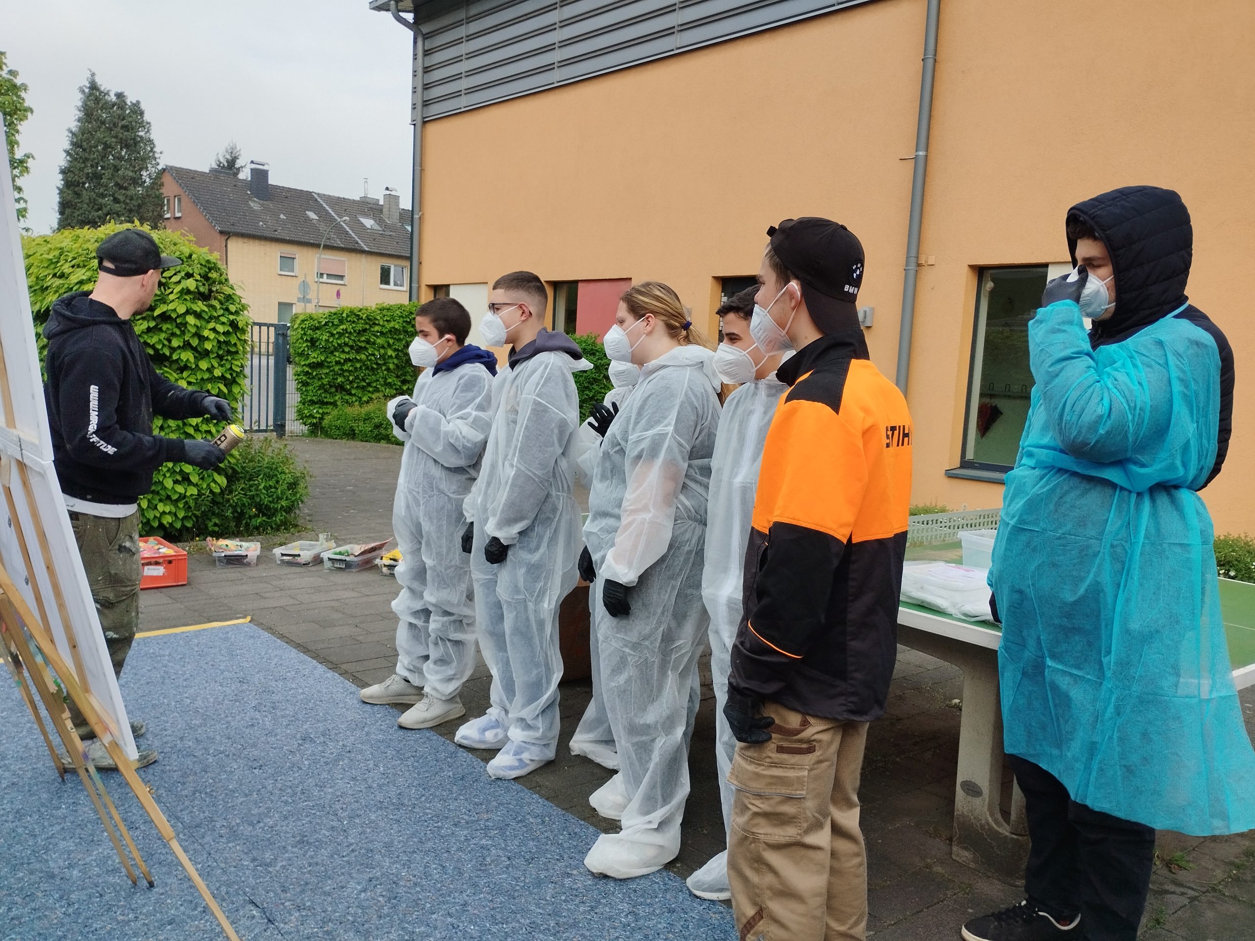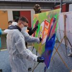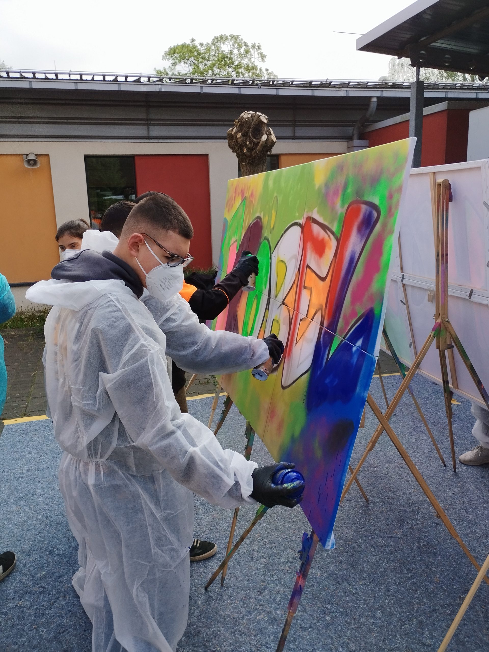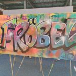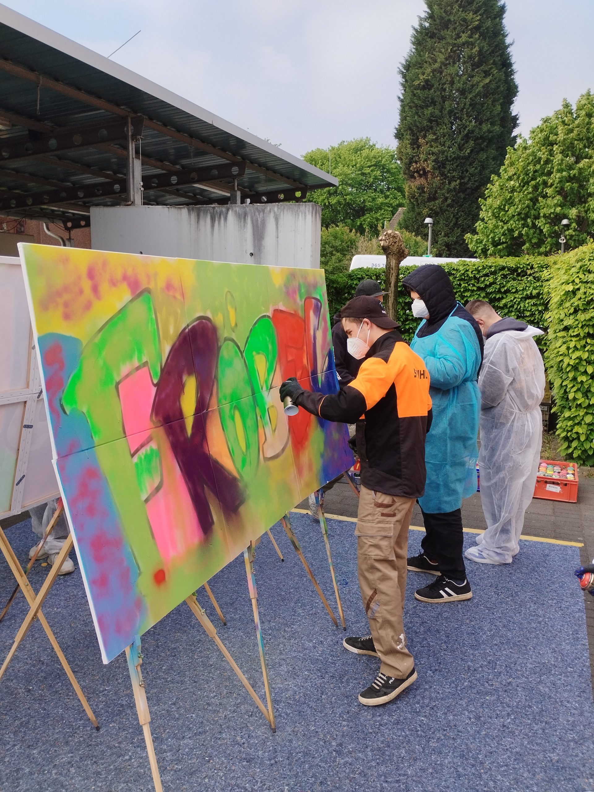 Am Dienstag, 21.04.26, fand mit SchülerInnen der Oberstufe endlich der lang ersehnte Graffiti Workshop mit dem Künstler Mark Roberz von Mr. Graffiti statt ( www.mrgraffiti.de ). Acht SchülerInnen haben dabei auf zwei Leinwänden den „Fröbel Schule“ Schriftzug mit viel Farbe und Schablonen gestaltet. Alle waren mit sehr viel Spaß und Kreativität dabei, so dass am Ende ein tolles buntes Ergebnis entstanden ist. Dieses kann seit Freitag nun auch im Eingangsbereich am Paschacker bewundert werden.